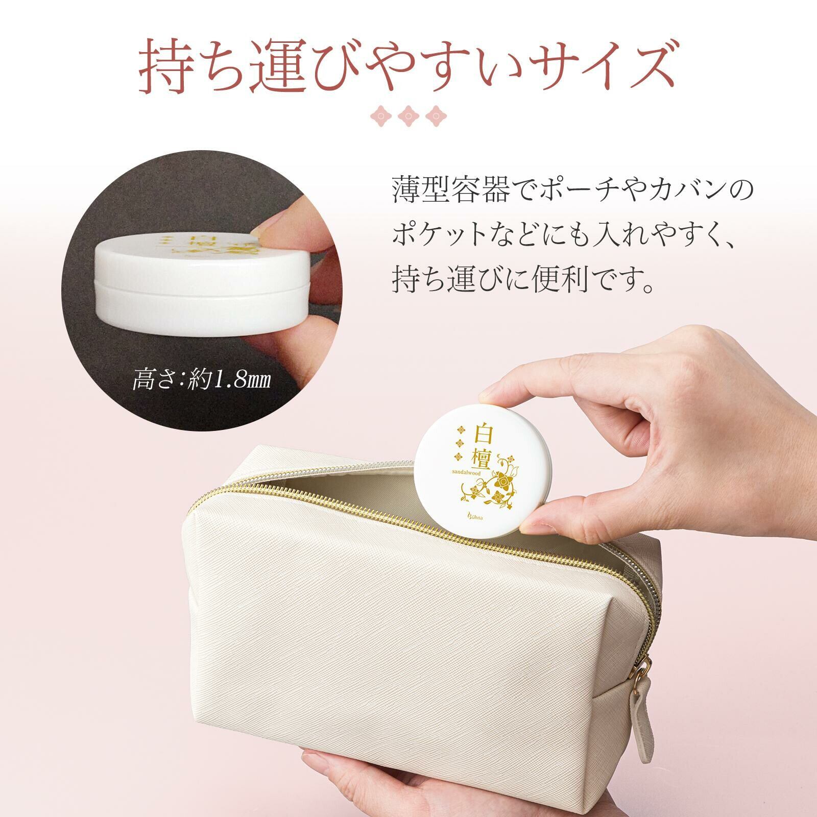 シトラス系のスッキリとした香りから白檀の香りへと変化。練り香水のため優しく白檀の香りが広がります。持ち運びにも便利なコンパクトサイズ。