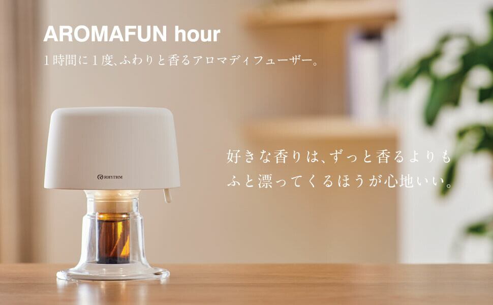 時の経過と香りを、楽しむことができるアロマディフューザーです。 AROMAFUN hourは、1時間に1度、香りを放出するため、 「ふと香るあの瞬間」を何度でも味わえます。 あかりとともに香るアロマで、くつろぎの時間をお楽しみください。